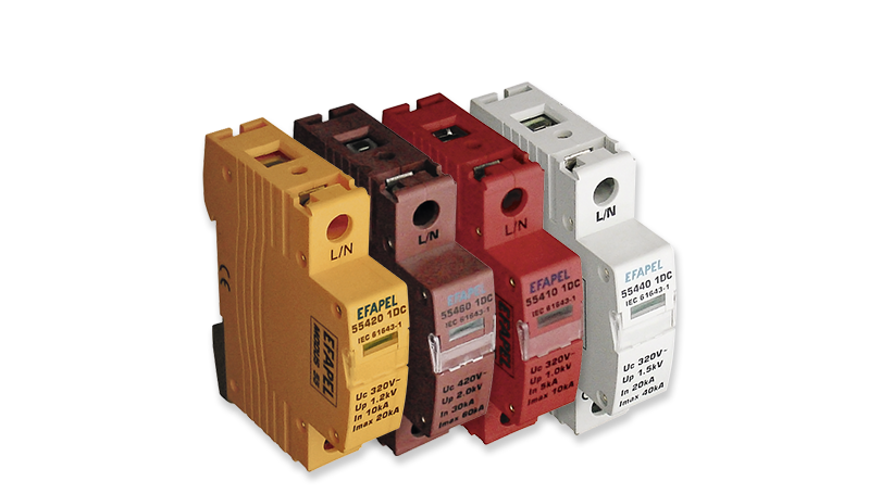Também a família Modus 55 disponibiliza proteções contra a tensão de alimentação, ou seja, contra sobretensões transitórias. Neste caso, os descarregadores de sobretensão power têm como principal função proteger a instalação elétrica contra sobretensões provocadas por descargas atmosféricas. Existem modelos unipolares divididos por diferentes valores de capacidade de escoamento da descarga elétrica.